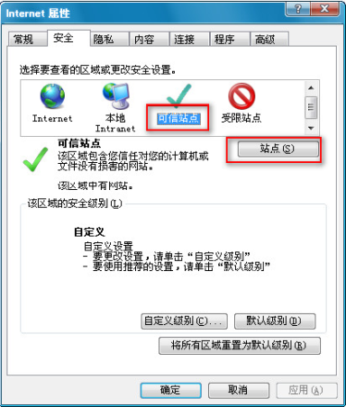 ? 選中“可信站點(diǎn)”后點(diǎn)擊[站點(diǎn)]按鈕,彈出如下圖。
