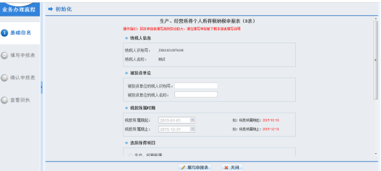 1、依次點擊菜單【申報繳稅—納稅申報--生產(chǎn)、經(jīng)營所得個人所得稅納稅申報(B表)】,點擊【申報】按鈕進入申報初始化頁面,如下圖所示。