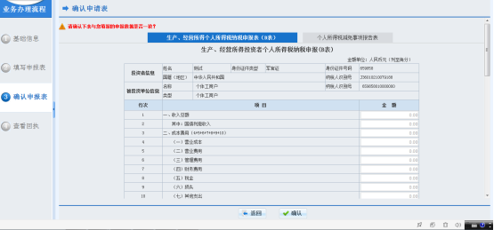 11、確認數(shù)據(jù)無誤后,點擊【確認】進行申報,系統(tǒng)返回申報回執(zhí)單;點擊【返回】鍵進行數(shù)據(jù)修改。