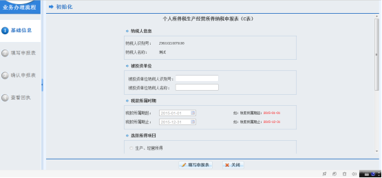 1、依次點(diǎn)擊菜單【申報(bào)繳稅—納稅申報(bào)--生產(chǎn)、經(jīng)營所得個(gè)人所得稅納稅申報(bào)(C表)】,點(diǎn)擊【申報(bào)】按鈕進(jìn)入申報(bào)初始化頁面,如下圖所示。