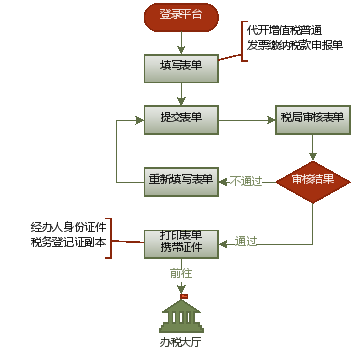 如果您是已辦理稅務登記的小規(guī)模納稅人(包括個體經(jīng)營者),需要開具增值稅普通發(fā)票時,可通過該功能向稅務機關(guān)申請代開增值稅普通發(fā)票,在平臺上填寫《代開增值稅普通發(fā)票繳納稅款申報單》(見右圖),提交并審核通過后,打印《代開增值稅普通發(fā)票繳納稅款申報單》,并攜帶《稅務登記證》副本、經(jīng)辦人身份證件,到辦稅大廳窗口或自助終端上預繳發(fā)票稅款并打印發(fā)票。