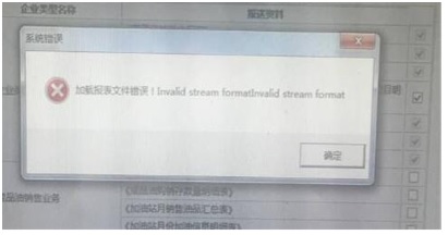 15、登錄網(wǎng)頁(yè)版網(wǎng)上稅務(wù)局進(jìn)行增值稅申報(bào),點(diǎn)擊填寫申報(bào)表后,頁(yè)面出現(xiàn)錯(cuò)誤提示,內(nèi)容為“加載報(bào)表文件錯(cuò)誤!Invalid stream formatlnvalid stream format”(如下圖),納稅人計(jì)算機(jī)系統(tǒng)為Win7(32位) 系統(tǒng),使用瀏覽器為IE11版本,應(yīng)如何解決?