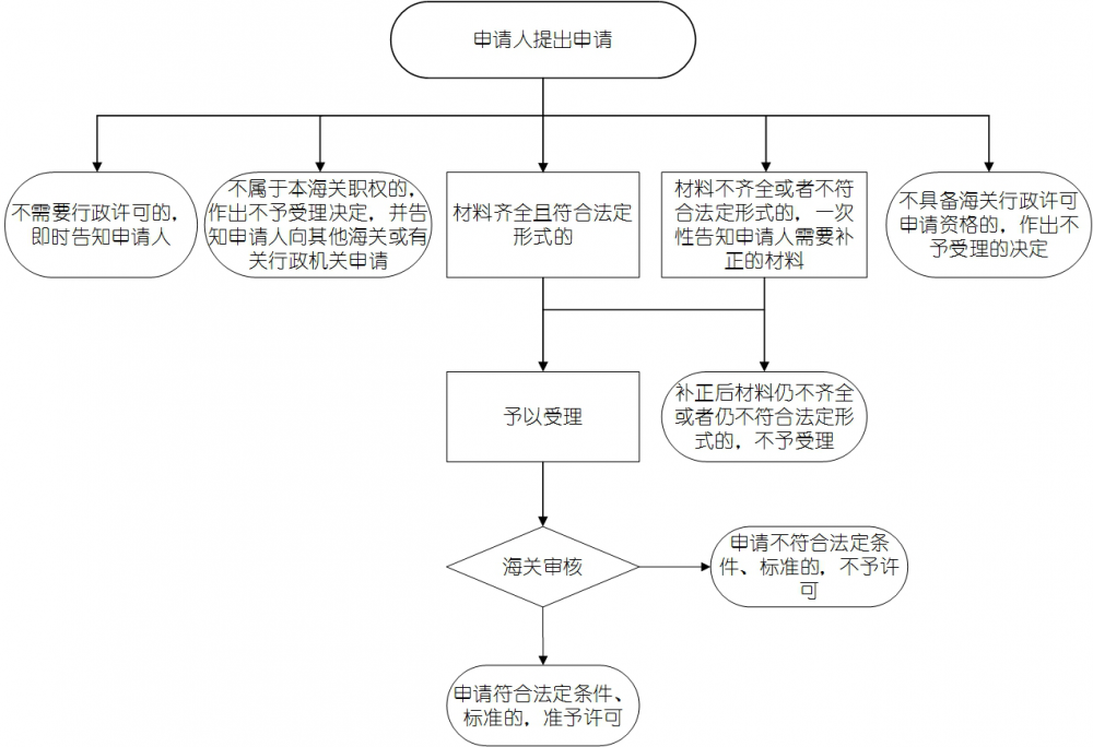 (一)申請人向海關(guān)遞交材料。海關(guān)向申請人出具《海關(guān)行政審批受理單》或《中華人民共和國XXX海關(guān)行政許可申請不予受理通知書》。