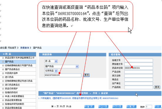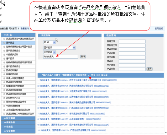 登錄國家局網(wǎng)站,進(jìn)入“數(shù)據(jù)查詢”欄目的“國產(chǎn)藥品”后使用示例如下: