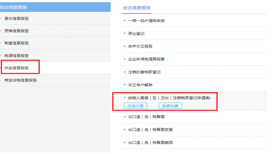 登錄路徑:云南省電子稅務(wù)局首頁-【我要辦稅】—【綜合信息報告】—【狀態(tài)信息報告】—【納稅人跨縣(區(qū))遷出(注銷稅務(wù)登記申請表)】—【在線辦理】