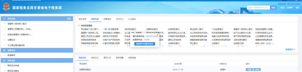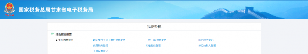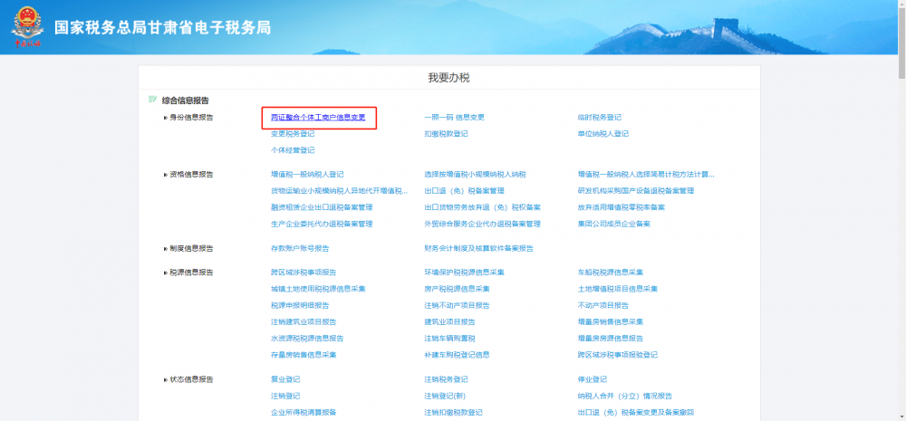 甘肅省電子稅務(wù)局-【辦稅桌面】--【我要辦稅】--【兩證整合個(gè)體工商戶(hù)】,即可進(jìn)入變更稅務(wù)登記界面。