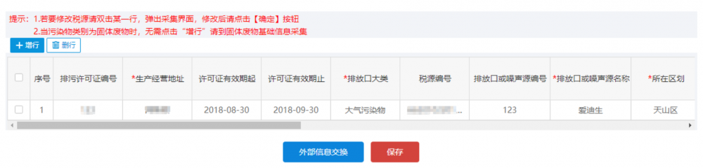 點擊【外部信息交換】按鈕查詢“排污許可證信息”,選擇查詢結(jié)果中的記錄,系統(tǒng)會自動填充采集表中的相應內(nèi)容。