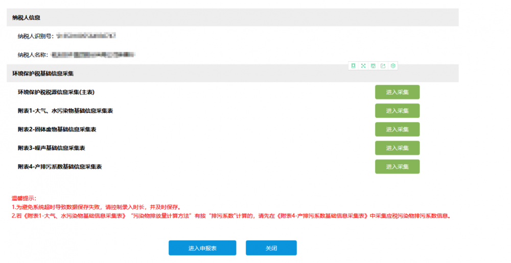 點擊每一個采集項目后的【進入采集】按鈕進行信息采集。采集完成后,點擊【進入申報表】進行“環(huán)境保護稅納稅申報”業(yè)務的辦理。
