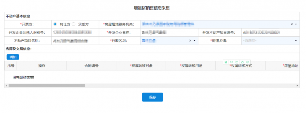 業(yè)務(wù)描述:房地產(chǎn)開發(fā)商進(jìn)行項(xiàng)目稅收申報時,應(yīng)當(dāng)按照有關(guān)規(guī)定報送房屋銷售合同和《增量房銷售信息表》,系統(tǒng)采集相關(guān)報送信息后,產(chǎn)生房源編號,同時記錄與不動產(chǎn)項(xiàng)目編號關(guān)聯(lián)關(guān)系;納稅人已銷售房產(chǎn)發(fā)生退回的,當(dāng)期應(yīng)收款欄目以負(fù)數(shù)形式體現(xiàn)。
