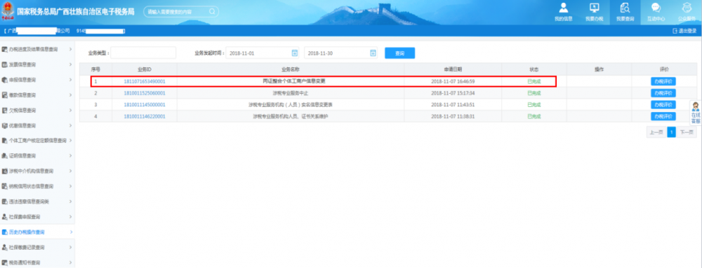 業(yè)務辦結后,可通過右上角【我要查詢—歷史辦稅操作查詢】,查看企業(yè)已經辦理完成的業(yè)務(即狀態(tài)為已完成、已作廢的業(yè)務),如下: