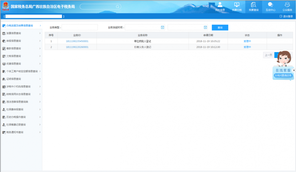 業(yè)務(wù)提交后,可通過右上角【我要查詢—辦稅進(jìn)度及結(jié)果信息查詢】,查看該業(yè)務(wù)辦理進(jìn)度及業(yè)務(wù)狀態(tài):