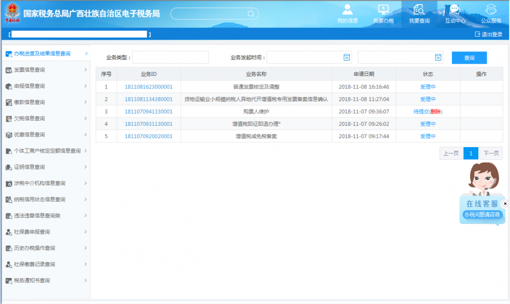 業(yè)務(wù)提交后,可通過(guò)右上角【我要查詢—辦稅進(jìn)度及結(jié)果信息查詢】,查看該業(yè)務(wù)辦理進(jìn)度及業(yè)務(wù)狀態(tài):
