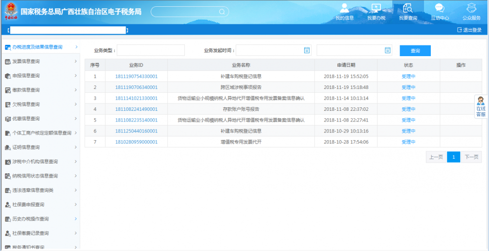 業(yè)務(wù)提交后,可通過(guò)右上角【我要查詢—辦稅進(jìn)度及結(jié)果信息查詢】,查看該業(yè)務(wù)辦理進(jìn)度及業(yè)務(wù)狀態(tài):