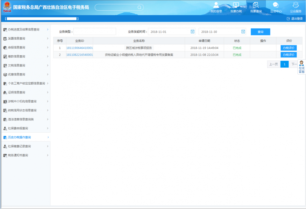 業(yè)務(wù)辦結(jié)后,可通過(guò)右上角【我要查詢—?dú)v史辦稅操作查詢】,查看企業(yè)已經(jīng)辦理完成的業(yè)務(wù)(即狀態(tài)為已完成、已作廢的業(yè)務(wù)),如下: