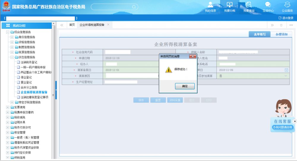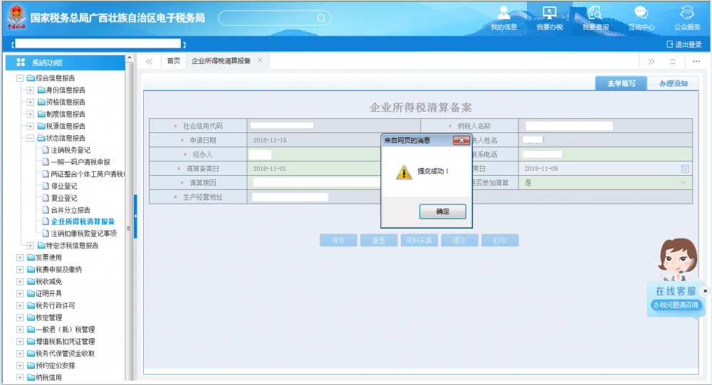待頁面提示“提交成功”后,點(diǎn)擊【確定】,頁面跳轉(zhuǎn)至辦稅進(jìn)度及結(jié)果信息查詢。