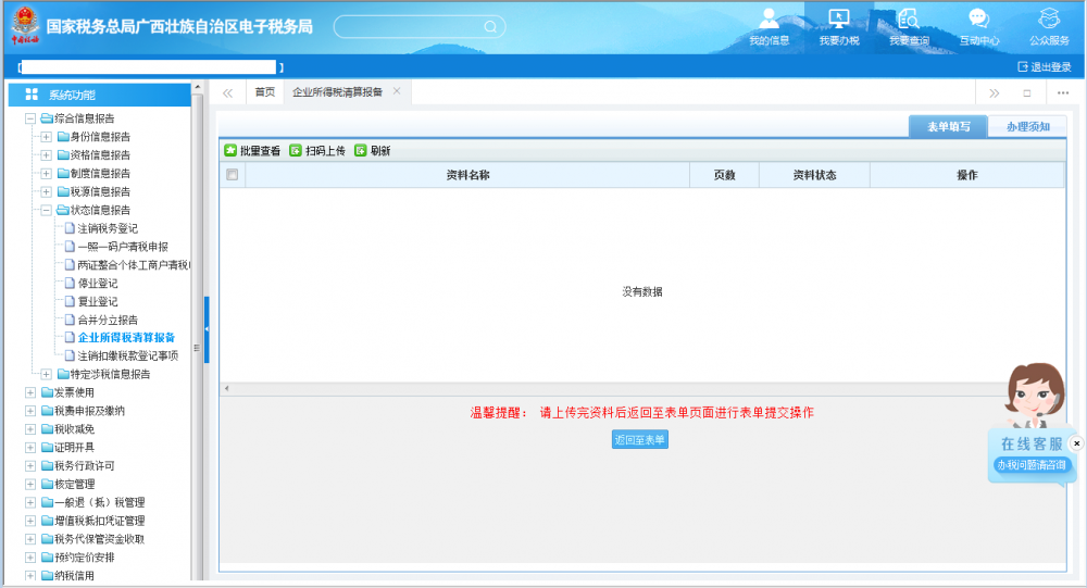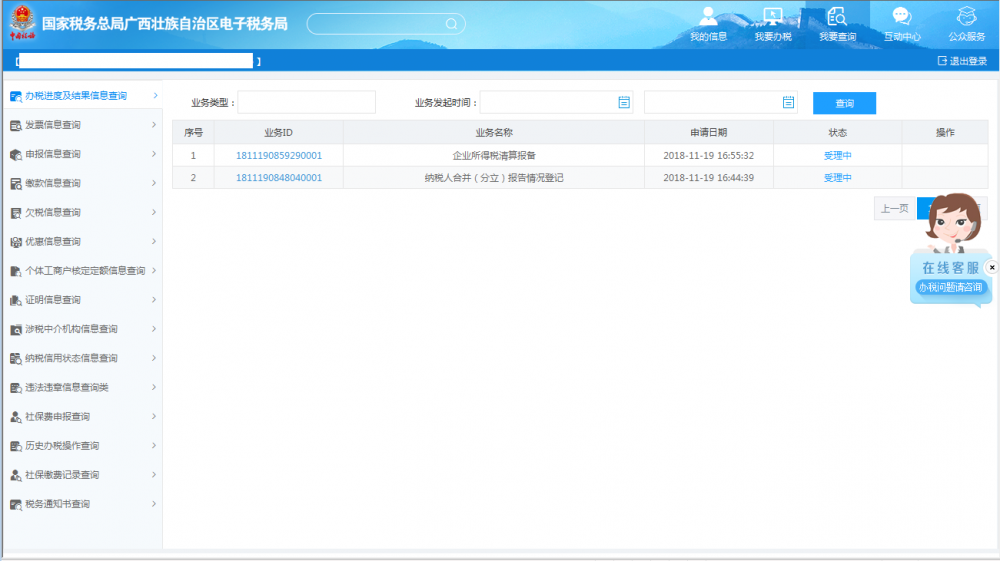 業(yè)務(wù)提交后,可通過右上角【我要查詢—辦稅進(jìn)度及結(jié)果信息查詢】,查看該業(yè)務(wù)辦理進(jìn)度及業(yè)務(wù)狀態(tài):