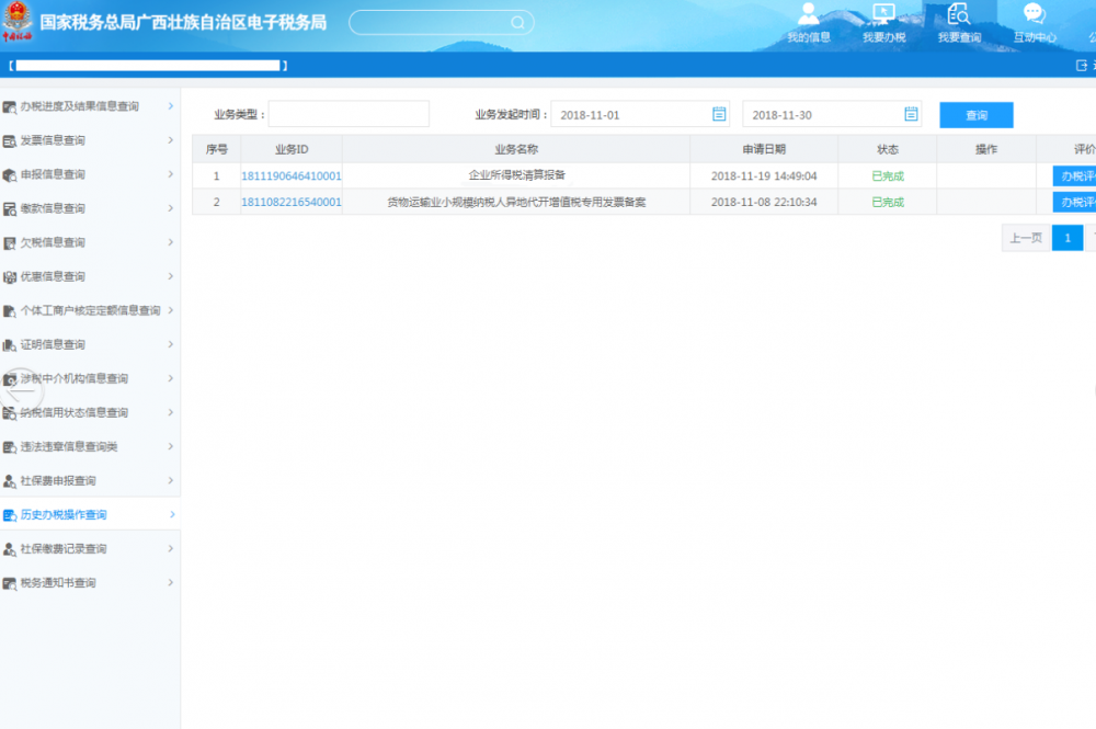 業(yè)務(wù)辦結(jié)后,可通過右上角【我要查詢—?dú)v史辦稅操作查詢】,查看企業(yè)已經(jīng)辦理完成的業(yè)務(wù)(即狀態(tài)為已完成、已作廢的業(yè)務(wù)),如下: