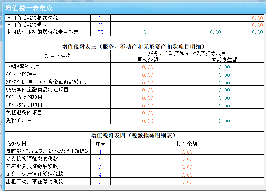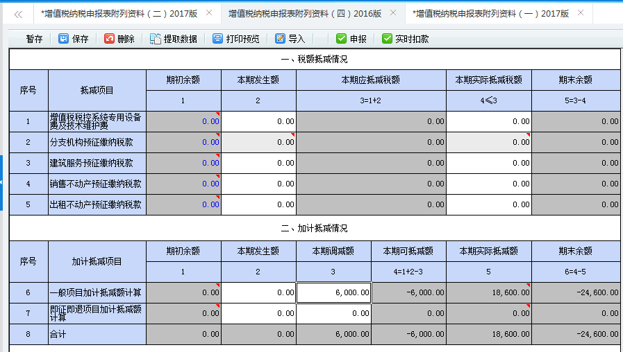 若一般納稅人的銷項(xiàng)稅額小于進(jìn)項(xiàng)稅額,本期應(yīng)納稅額為0,加計(jì)抵減額顯示在第6行“期末余額”列,留待下期抵減。如下圖所示。