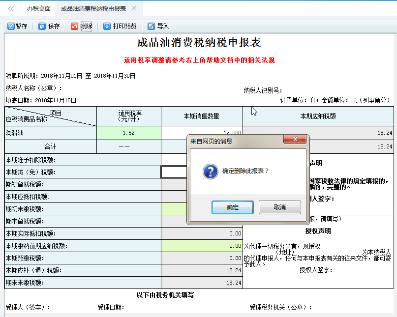 3.保存后如果發(fā)現(xiàn)數(shù)據(jù)有問題,可點擊【刪除】按鈕進行刪除保存數(shù)據(jù),待頁面彈出提示框提示“確定刪除此報表?”,點擊【確定】按鈕,表單填寫的內(nèi)容被刪除: