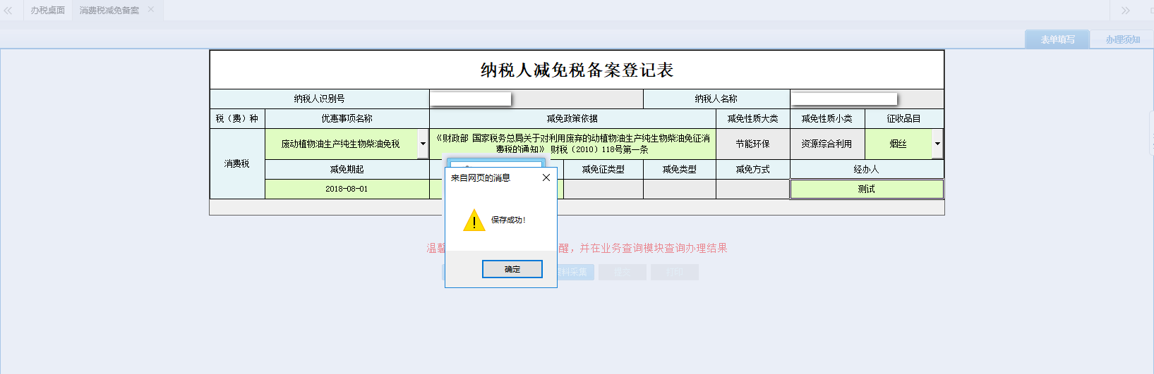 2.點(diǎn)擊【保存】按鈕,待頁面彈出提示框提示“保存成功!”,點(diǎn)擊【確定】按鈕,表單填寫的內(nèi)容被保存。