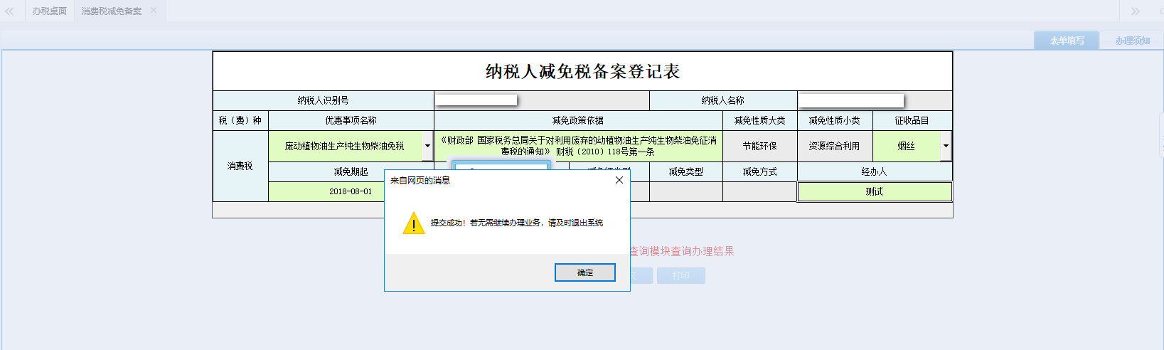 4.點(diǎn)擊【返回至表單】,頁面跳轉(zhuǎn)至表單頁面;確認(rèn)填寫無誤后,點(diǎn)擊【提交】按鈕,待頁面提示“提交成功!若無需繼續(xù)辦理業(yè)務(wù),請及時(shí)退出系統(tǒng)!”后,點(diǎn)擊【確定】,頁面跳轉(zhuǎn)至辦稅進(jìn)度及結(jié)果信息查詢: