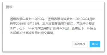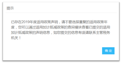 3.選擇完年度后,系統(tǒng)將根據(jù)選擇的年度查詢是否已經(jīng)存在有效的加計抵減聲明,若已存在,將給出提示。