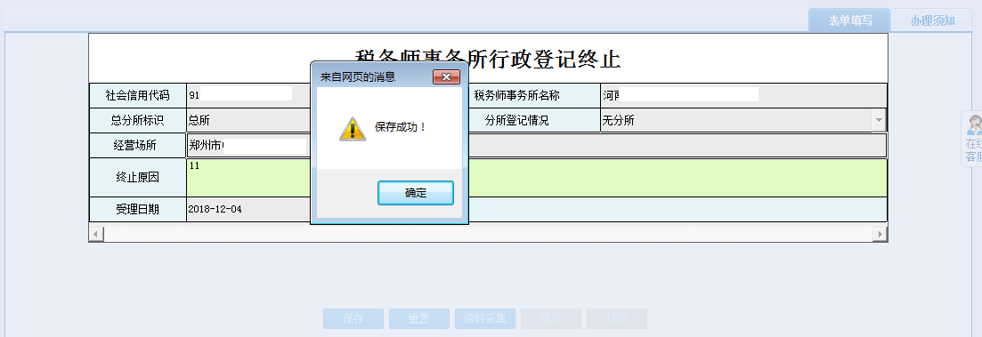 2.點擊【保存】按鈕,待頁面彈出提示框提示“保存成功!”,點擊【確定】按鈕,表單填寫的內(nèi)容被保存。