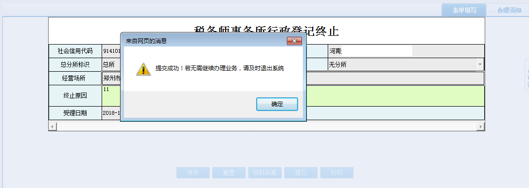 3.若該業(yè)務(wù)沒有需要上傳的資料,確認填寫無誤后,點擊【提交】按鈕,待頁面提示“提交成功!若無需繼續(xù)辦理業(yè)務(wù),請及時退出系統(tǒng)!”后,點擊【確定】,頁面跳轉(zhuǎn)至辦稅進度及結(jié)果信息查詢: