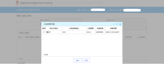 選中一條土地信息,點擊“確定”,自動將該土地的的轉讓方錄入的轉讓信息帶入承受頁面。