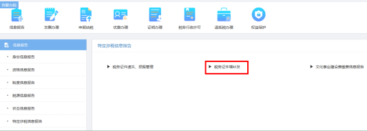 一、納稅人以企業(yè)身份登錄重慶市電子稅務(wù)局,點(diǎn)擊【我要辦稅】 - 【信息報(bào)告】 - 【特定涉稅信息報(bào)告】-【證件增補(bǔ)發(fā)】進(jìn)入功能模塊。
