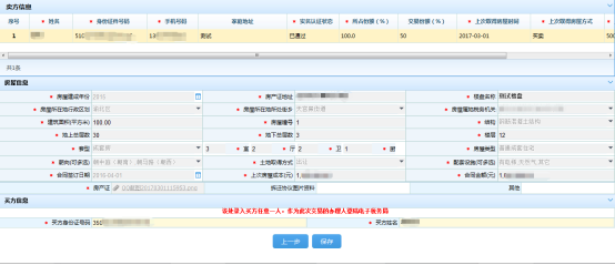 6.點(diǎn)擊“下一步”按鈕,進(jìn)入房源信息采集頁面,系統(tǒng)自動(dòng)帶出賣方共有人房源信息選擇房源并點(diǎn)“確定”按鈕返回房源信息頁面;