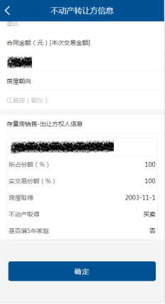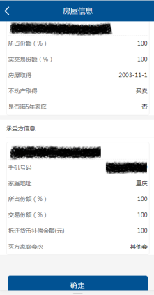 1. 點(diǎn)錄入買方信息后點(diǎn)擊【確定】進(jìn)入“房屋信息”頁面,系統(tǒng)帶出房屋基本信息和買賣雙方信息,確認(rèn)信息后點(diǎn)擊【確定】按鈕保存信息,提交預(yù)審信息