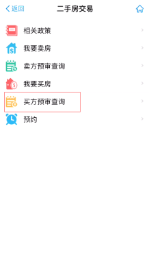 進(jìn)入“二手房交易”頁面,點(diǎn)擊【買方預(yù)審查詢】即可進(jìn)入“預(yù)審狀態(tài)”頁面查看預(yù)審狀態(tài)