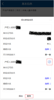 1. 點(diǎn)擊【添加家庭成員】,選擇產(chǎn)權(quán)人名稱、家庭關(guān)系、婚姻狀況、輸入家庭成員,身份證號碼