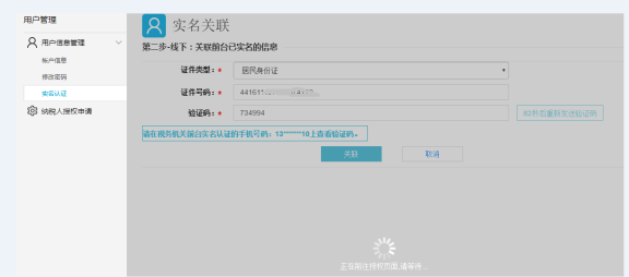 3) 選擇證件類型和輸入證件號碼,然后獲取驗證碼。獲取驗證碼輸入后點擊【關聯(lián)】按鈕。