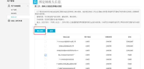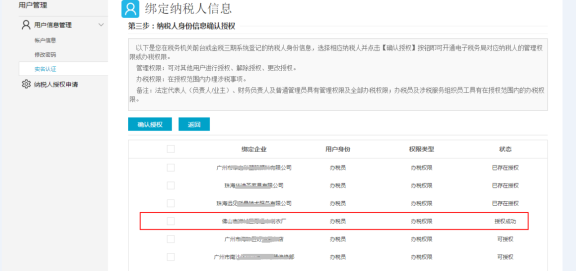 4) 成功關聯(lián)后頁面自動跳轉到納稅人身份信息列表,可以在這里確認權限。