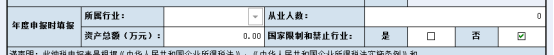 3、首先填寫“年度申報時填報”一欄,包括“所屬行業(yè)”、“從業(yè)人數(shù)”、“資產(chǎn)總額(萬元)”、“國家限制和禁止行業(yè)”。只有先填寫這一欄,系統(tǒng)才會自動判斷是否符合減免。