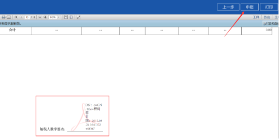 11、核對數(shù)據(jù)無誤后,若納稅人為CA用戶,則需點擊【納稅人數(shù)字簽名】,進行簽名,然后點擊【申報】,進行提交申報。若納稅人不為CA用戶,則無需進行CA簽名,直接點擊【申報】,提交申報表。