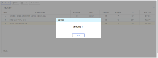 5、 附列資料逐個(gè)上傳完畢,點(diǎn)擊“提交”按鈕,系統(tǒng)將提示提交成功,該申請(qǐng)?zhí)峤坏蕉悇?wù)機(jī)關(guān)系統(tǒng)中,申請(qǐng)操作全部完成。