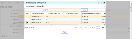 2、 將鼠標(biāo)放在項(xiàng)目編號(hào)處回車,系統(tǒng)帶出不動(dòng)產(chǎn)項(xiàng)目信息選擇頁面,操作人員勾選或者通過項(xiàng)目編號(hào)查詢需要申報(bào)的不動(dòng)產(chǎn)信息,確認(rèn)后點(diǎn)擊 “確定”帶回主頁面。