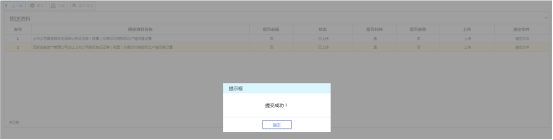 6、 附列資料逐個上傳完畢,點擊“提交”按鈕,系統(tǒng)將提示提交成功,該申請?zhí)峤坏蕉悇諜C關系統(tǒng)中,申請操作全部完成。