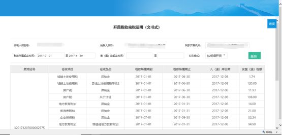 ? 在[開具稅收完稅證明]頁面,選擇稅款所屬起止日期(不能跨年);選擇按明細(xì)開具或者按匯總開具,點(diǎn)擊查詢,查詢出相關(guān)結(jié)果后,點(diǎn)擊“開具”。