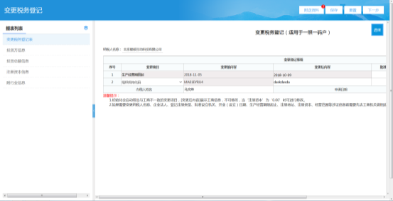 第五步:選擇變更項(xiàng)目,會(huì)自動(dòng)帶出變更前內(nèi)容,輸入變更后內(nèi)容,點(diǎn)擊保存則暫存填表內(nèi)容;點(diǎn)擊重置,則表格還原到初始狀態(tài);點(diǎn)擊下一步,提交報(bào)表;