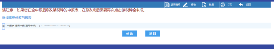 5、點(diǎn)擊頁(yè)面右上方的【修改】,即可跳轉(zhuǎn)至修改頁(yè)面,展示提交了的申報(bào)表,點(diǎn)擊選 中申報(bào)表,再點(diǎn)擊頁(yè)面下方【修改】按鈕即可修改申報(bào)表信息。