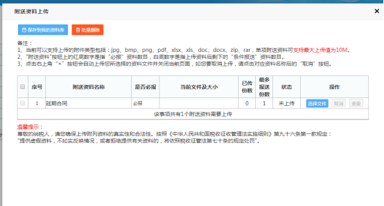 ? 點(diǎn)擊“附送資料”可查看并上傳所需的附送資料,其中顯示“必報(bào)”的必 須上傳,“條件報(bào)送”的可自行選擇是否上傳,點(diǎn)擊選擇文件,進(jìn)行上傳。