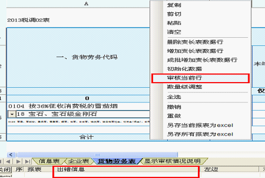 選定某一未通過(guò)審核的數(shù)據(jù)行的任一單元格,點(diǎn)擊鼠標(biāo)右鍵,在菜單中選擇【審核當(dāng)前行】,系統(tǒng)將在審核窗口中顯示審核提示信息。根據(jù)提示信息修改數(shù)據(jù)即可。