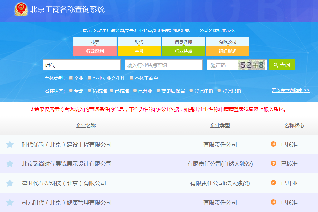 例如:在字號查詢搜索欄中輸入“時(shí)代”,點(diǎn)擊查詢,系統(tǒng)展現(xiàn)所有字號包含“時(shí)代”的名稱,如下圖所示: