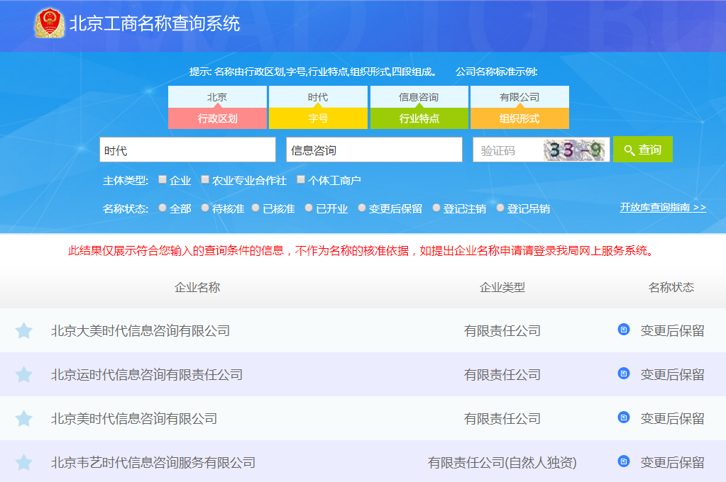 例如:繼續(xù)在行業(yè)特點(diǎn)搜索欄中輸入“信息咨詢”,點(diǎn)擊查詢,系統(tǒng)展現(xiàn)所有字號包含“時(shí)代”、行業(yè)特點(diǎn)包含“信息咨詢”的名稱,如下圖所示: