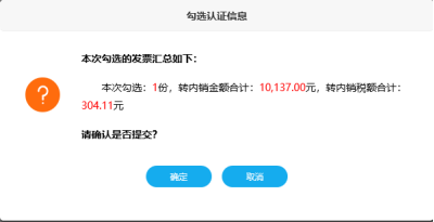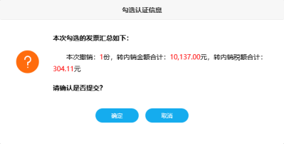 2)、用戶根據(jù)查詢結(jié)果選擇發(fā)票進(jìn)行抵扣勾選操作,確認(rèn)本次需要勾選的發(fā)票全部勾選完成后,可以點(diǎn)擊“提交”按鈕,彈出勾選認(rèn)證信息對(duì)話框如下: