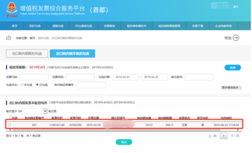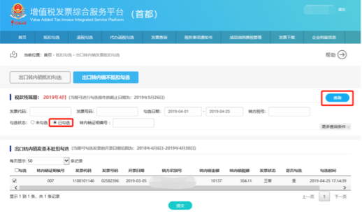 1)、勾選狀態(tài)選擇“已勾選”,點(diǎn)擊查詢,可查詢到已經(jīng)勾選的出口轉(zhuǎn)內(nèi)銷發(fā)票信息,如下顯示: